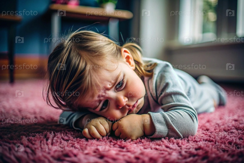Маленькая девочка лежит на полу. Детская истерия. Ребенок кричит, плачет, становится капризным и истеричным. Недовольство