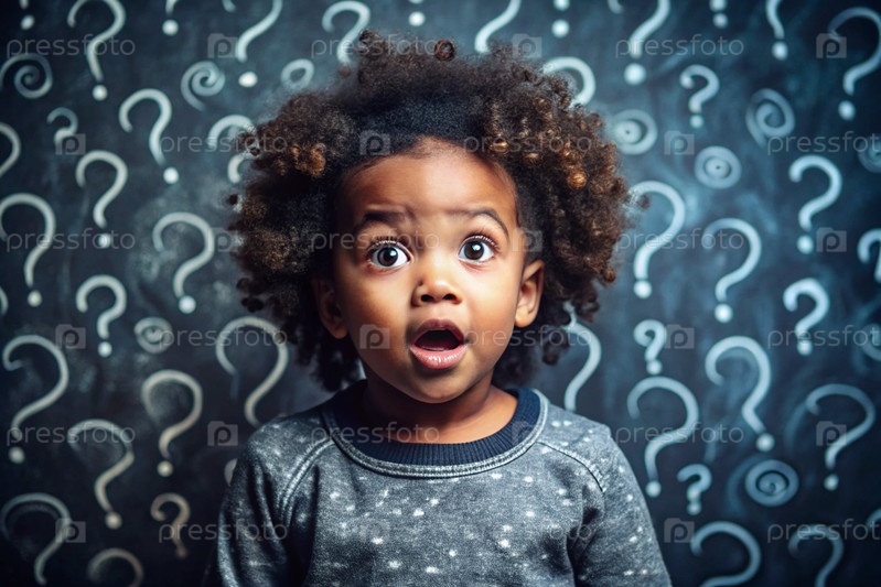 Развитие и образование детей. удивленная афроамериканская чернокожая девушка на темном фоне с вопросительными знаками. мозговой штурм, вопросы детей и концепция идеи