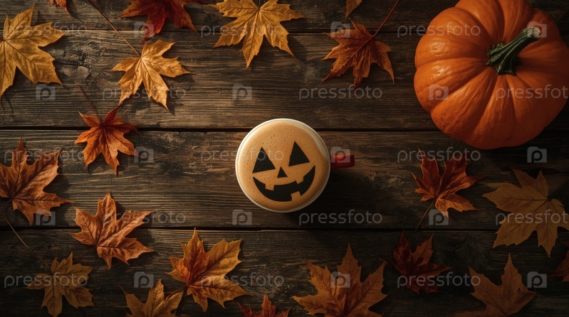 Хэллоуин. тыква, осенние листья и чашка кофе на столе. вид сверху, деревянная поверхность