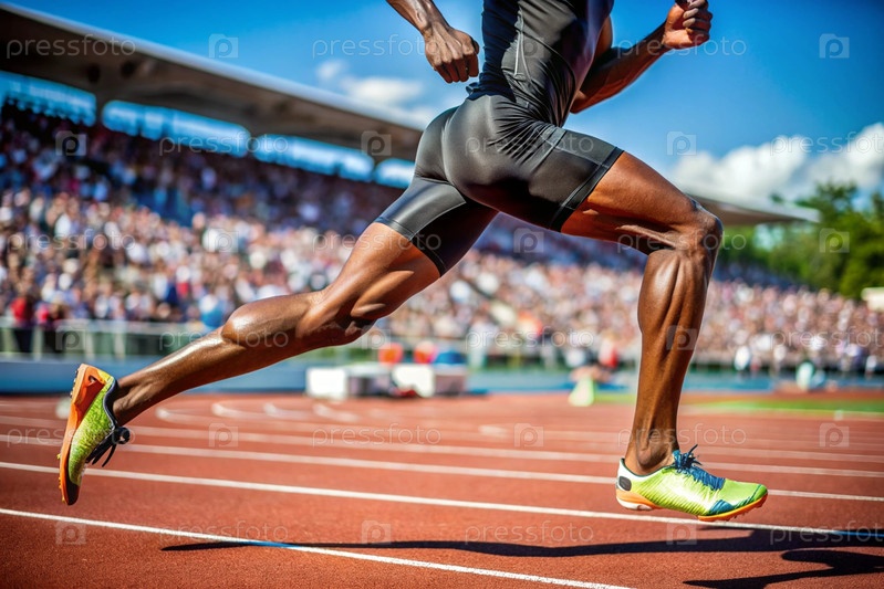 Ноги чернокожего афроамериканского спортсмена сближаются во время спринтовой гонки на спортивном мероприятии