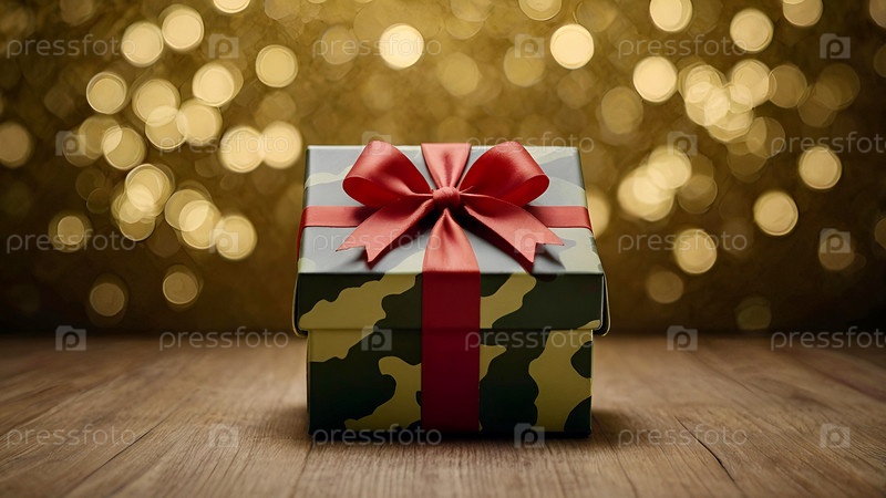 Концепция Дня защитника Отечества 23 февраля.Подарок камуфляжной коробки с праздничной сатинной лентой лука на золотом фоне