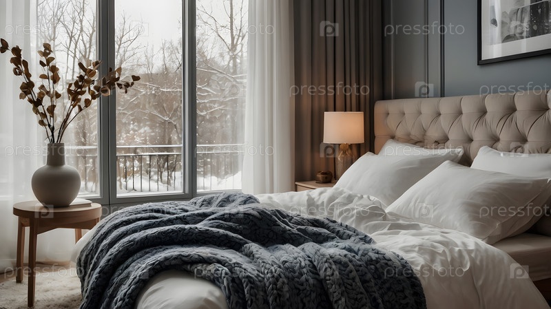 Интерьер современного дома.Минималистский уютный интерьер спальни с головкой, постельным бельем, подушками и ночным столом