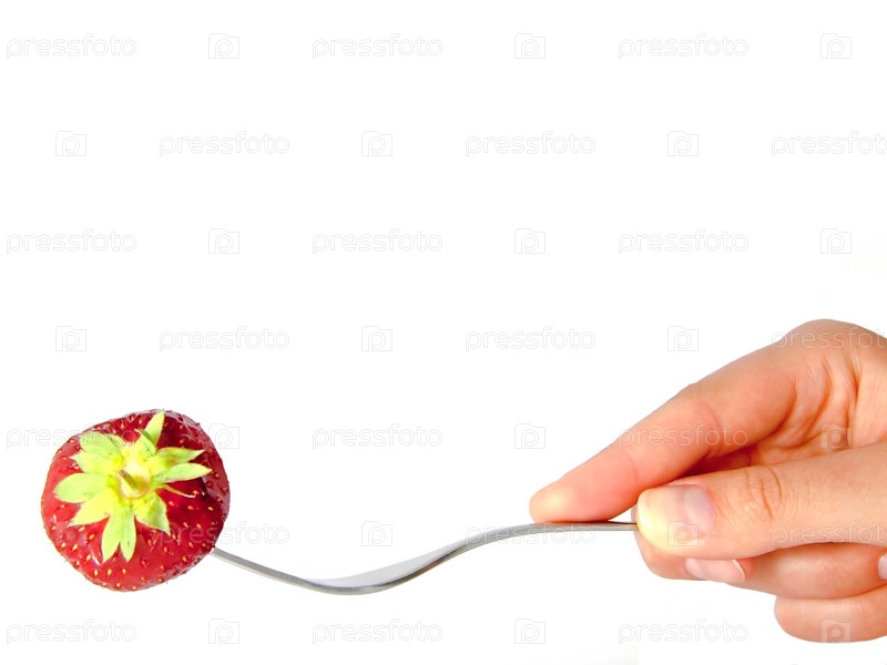 Ягода клубники на вилке на белом фоне