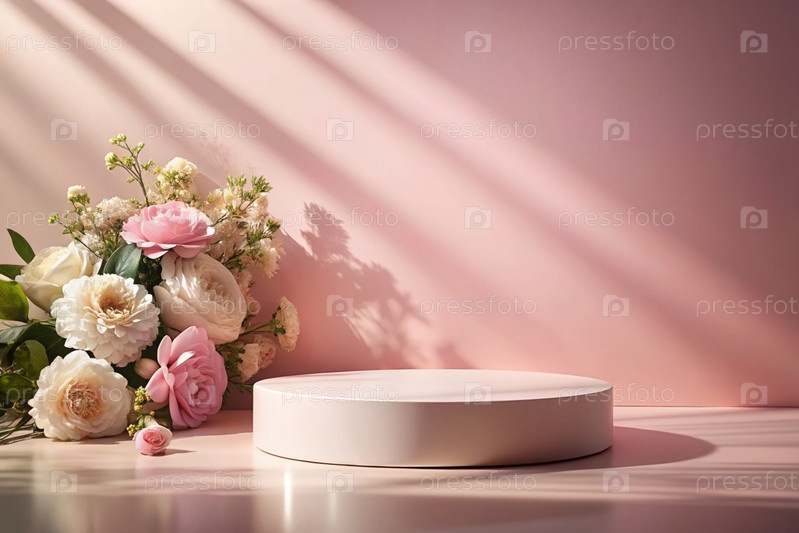 Минималистский розовый пастельный фон для демонстрации продукта.Современная подиум с розовой стеной и цветами вокруг.Креативный дизайн презентации продукции