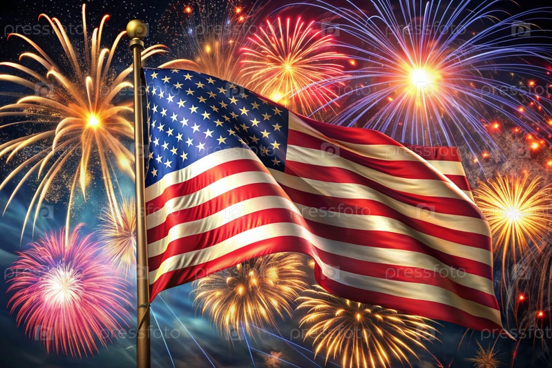 Флаг США с фейерверком в небе День независимости - 4 июля под открытым небом