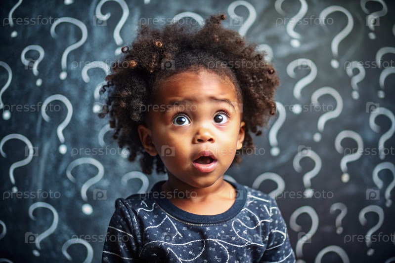 Развитие и образование детей. удивленная афроамериканская чернокожая девушка на темном фоне с вопросительными знаками. мозговой штурм, вопросы детей и концепция идеи