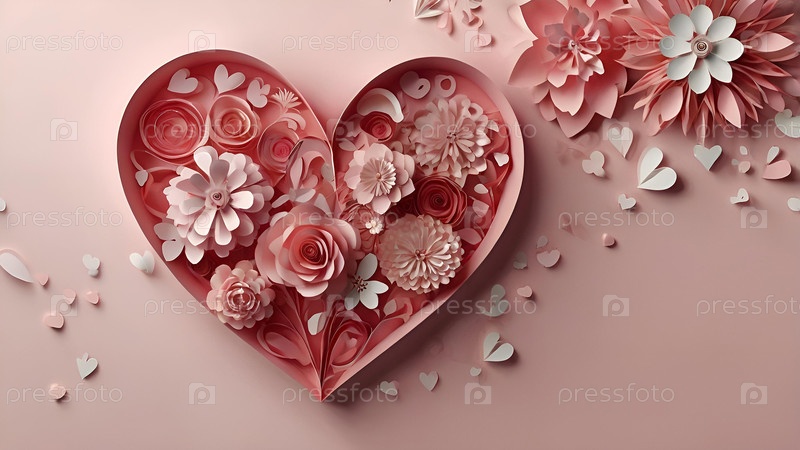 Концепция Дня святого Валентина с розовым сердцем, изображающим Любовь. Стильный дизайн цветов на бумаге. Копировальное пространство