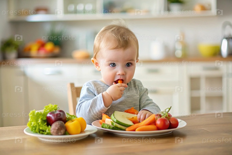 Здоровое детское питание. Первая еда. Кормить ребенка. Милый ребенок ест свежие овощи