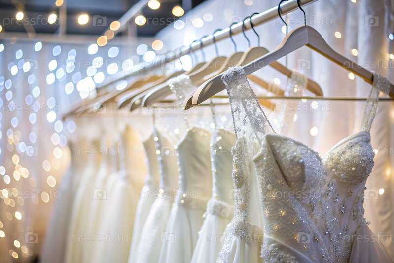 Аренда и покупка свадебных платьев для мероприятий. Близкие. Свадебные белые платья висят с белых вешалок на стойке в свадебном салоне магазина