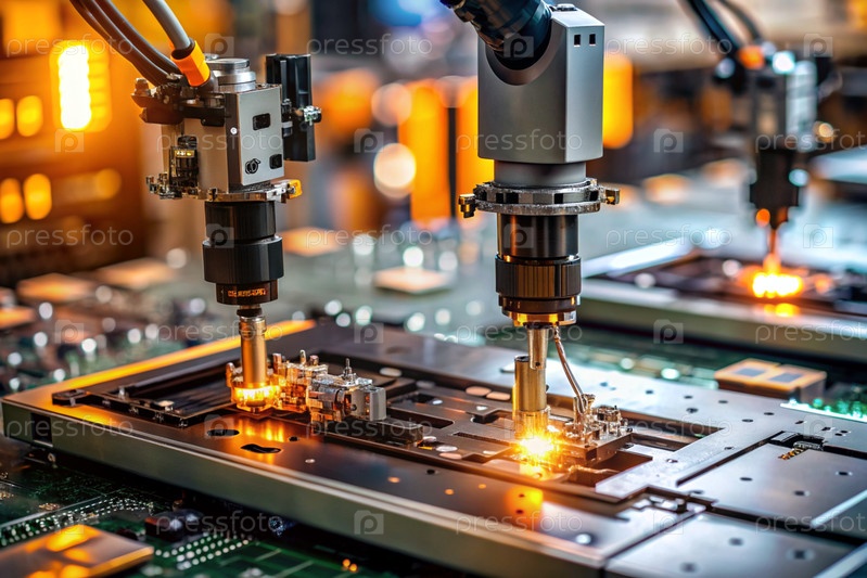 Автоматизированное производство электронных устройств. Современные роботизированные манипуляторы на сборочной линии чипов и печатных платок на современном электротехническом заводе. Установка компонентов на доске