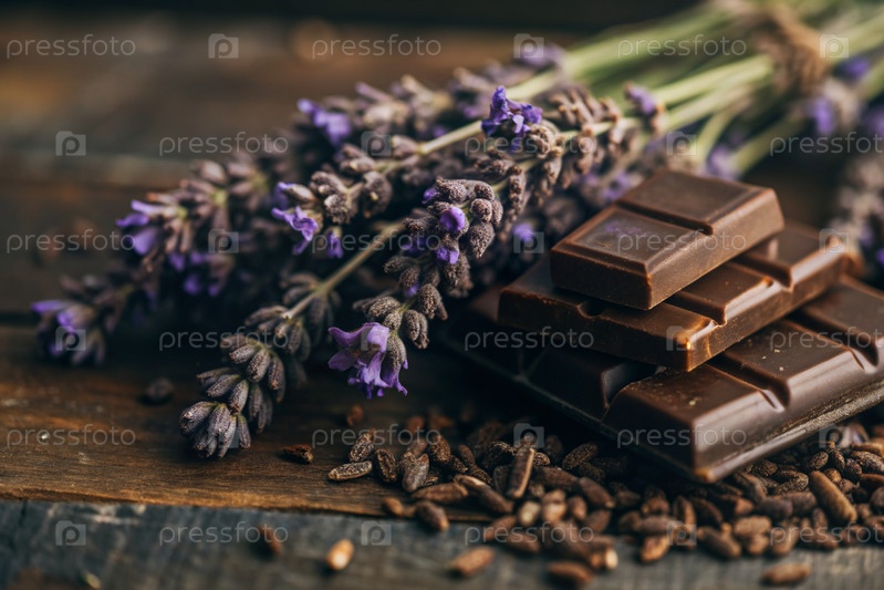 Кусочки шоколада с веточками лаванды для десерта на деревянном фоне
