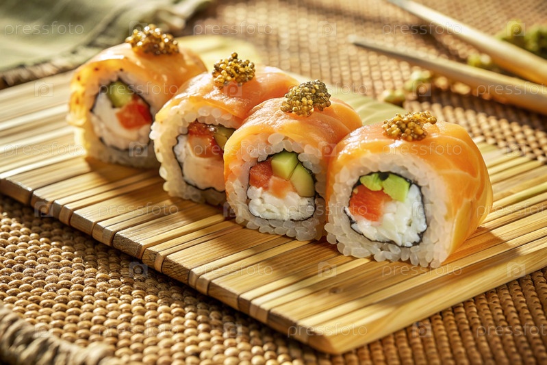 Японская еда. Суши-роллы Калифорния, Филадельфия с угорьем, красной икры и лососем. Концепция меню суши-бара