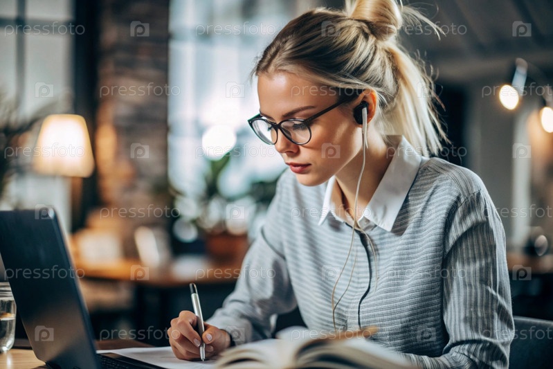 Молодая женщина фрилансер в очках и наушниках работает на ноутбуке или делает покупки в интернет-магазине