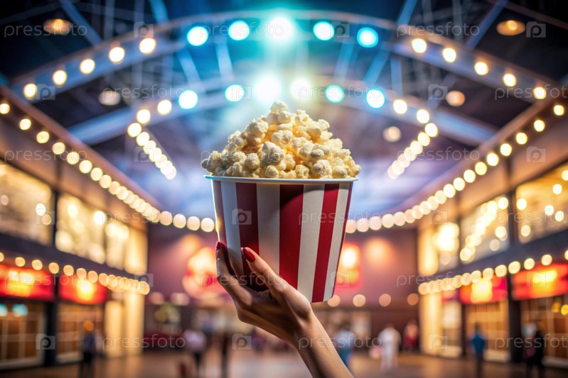 Красно-белый полосатый ящик с солеными попкорнами в руке на фоне светофоров кинотеатра
