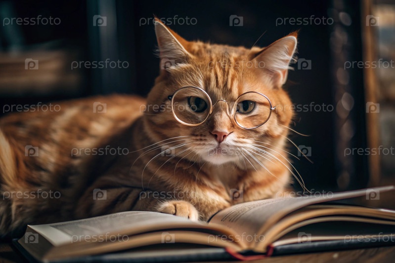 Красивая, большая рыжая кошка с модными круглыми очками для чтения лежит на деревянном столе со своей книгой