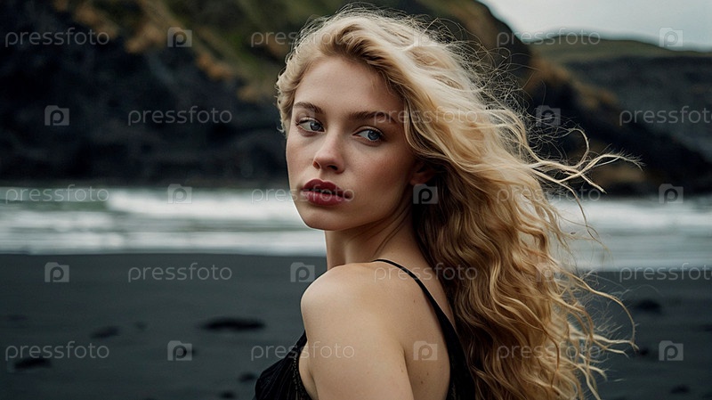 Портрет красивой женщины на пляже с черным песком против моря.Романтическая, спокойная и чувственная фотография девушки в нежном чёрном платье