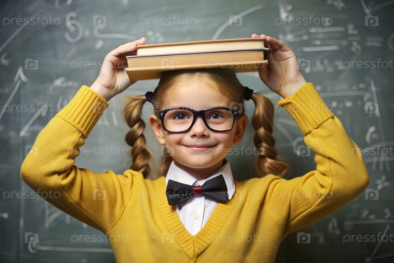 Красивая девушка с очками и книгами на голове. Ребенок впервые идет в школу. Ребёнок в классе со доской на заднем плане. Возвращение к школе