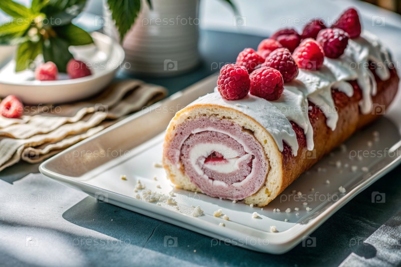 Швейцарская губка с малиной, вкусный фруктовый и сливочный десерт наполненный кремовым сыром, украшенный свежими малинами