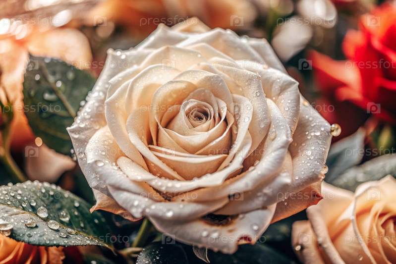 Кремовая роза красивого цвета кофе или шампанского, покрытая росой на рассвете. Красивое солнечное сияние. Фон изображения выполнен в зеленых и бежевых тонах. Естественный, экологически чистый естественный фон
