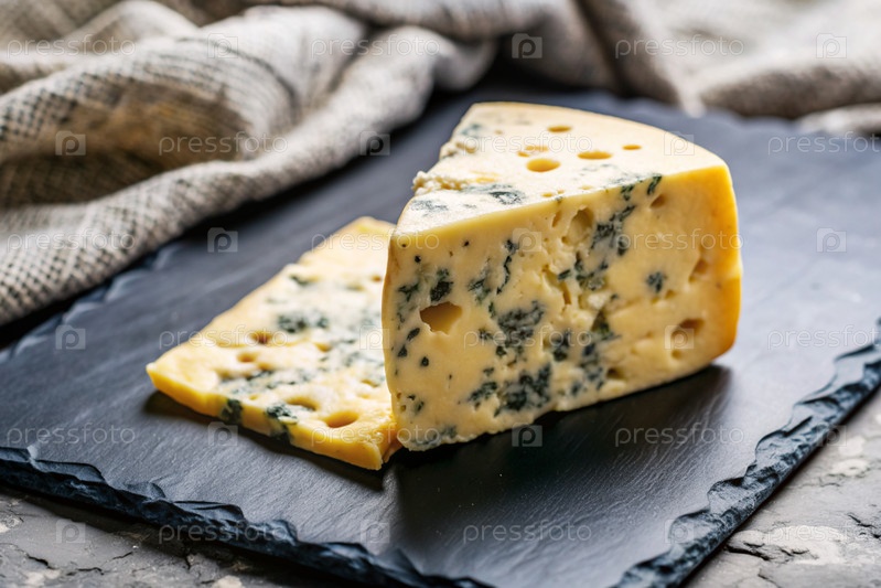 Сыр с плесенью, кусок сыра с синей дверью или Рокфор на режущей доске