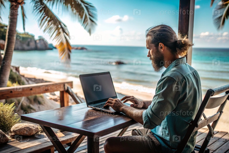 Молодой бизнесмен-фрилансер работает на ноутбуке, отдыхая у моря или делая покупки в Интернете