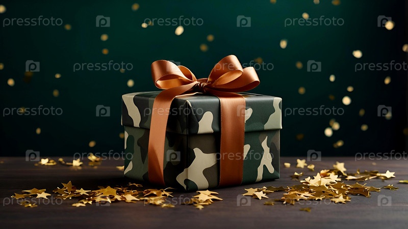 Концепция Дня защитника Отечества 23 февраля.Подарок камуфляжной коробки с праздничной сатинной лентой лука на тёмно-зеленом фоне