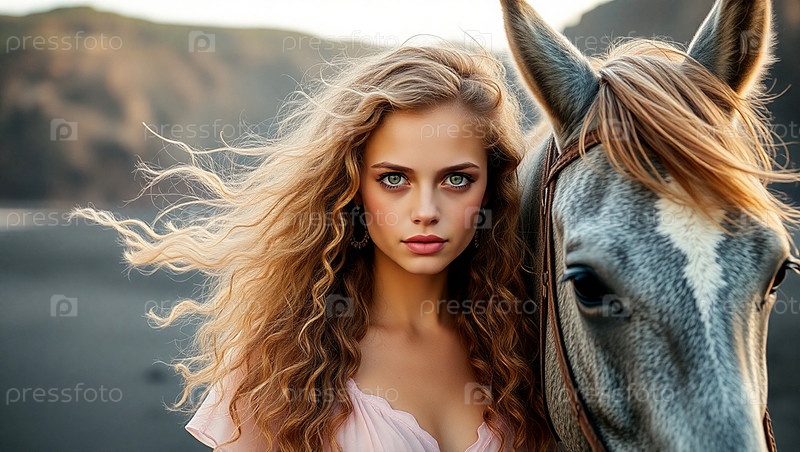 Портрет красивой женщины и лошади на пляже против моря.Романтическая, спокойная и чувственная фотография девушки в проветренном нежном платье