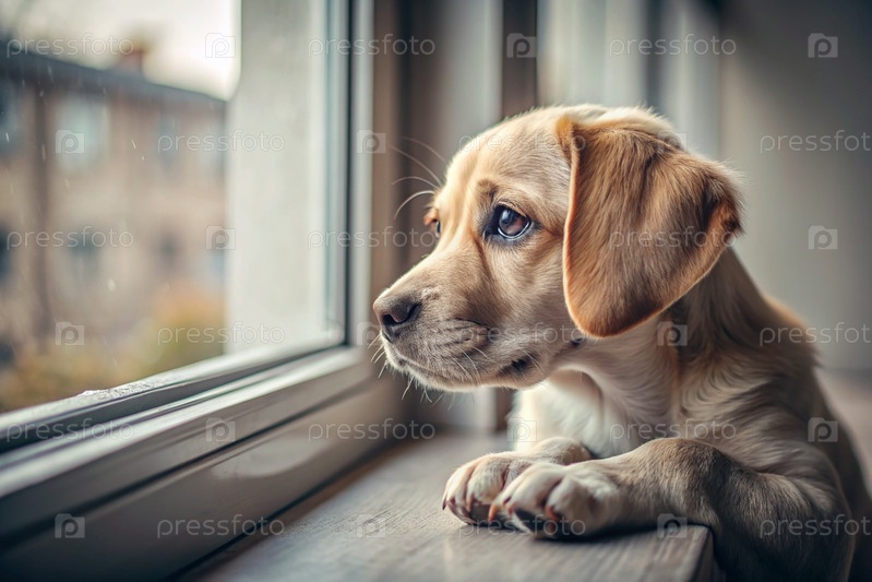 Маленький щеночек смотрит в окно и ждет своего хозяина