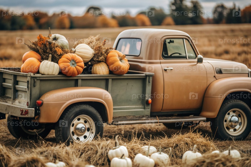 Осень, осенний дизайн.Большой урожай тыквы на заднем сиденье ретро-пикапа, крупный план