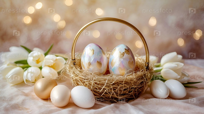 Нежные пасхальные яйца в жемчужной корзине и нежные цветы на пастельно-водном фоне