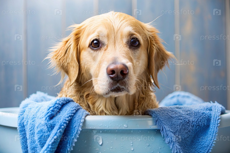 Золотой ретривер купается в пузырьковой ванне. Помыть собаку. Концепция ухода за домашними животными