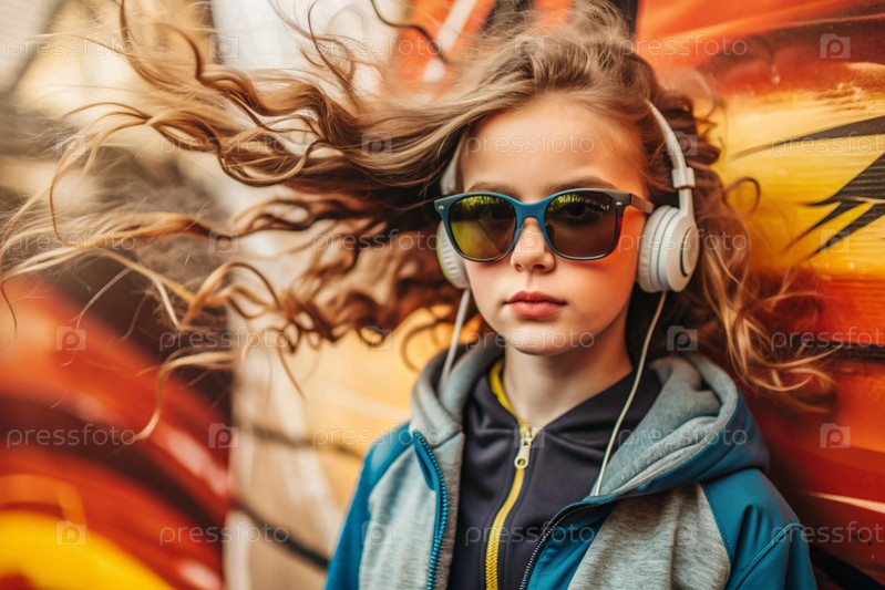 Молодая красивая девушка с большими наушниками и солнцезащитными очками слушает музыку на ушах