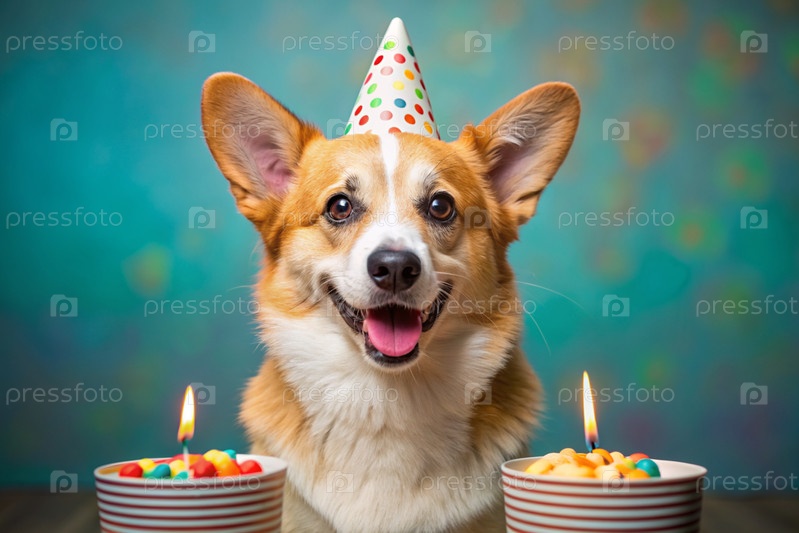 Собака сидит с тортом, воздушными шарами и флагами на вечеринке по случаю дня рождения