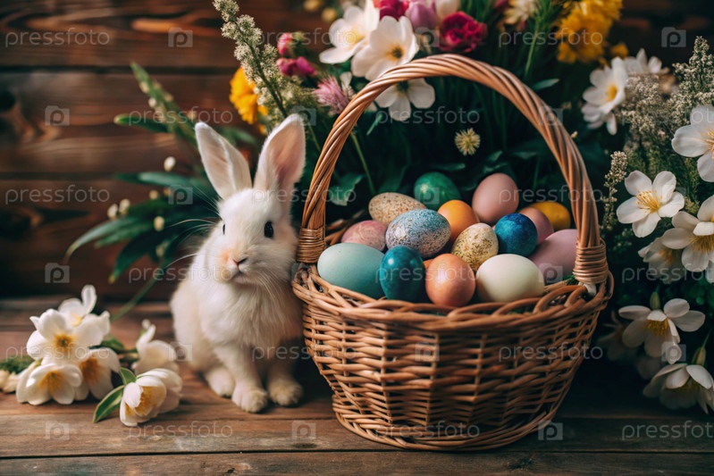 Баннер. пасхальный кролик в плетеновой корзине, наполненной красочными пасхальными яйцами. концепция весенних праздников Пасхи