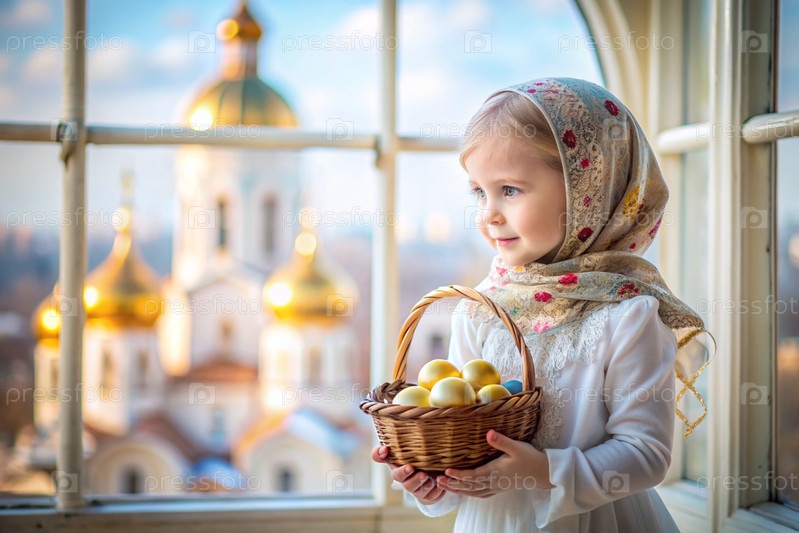 Счастливая Пасха. Христианство. Портрет трехлетней девочки в русском народном платье и шалах с корзиной из плети с пасхальными яйцами в руках на фоне православной церкви