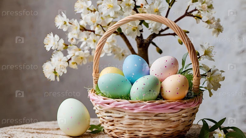 Красивый фон с пасхальными яйцами в плетеновой корзине и весенними вишневыми цветами