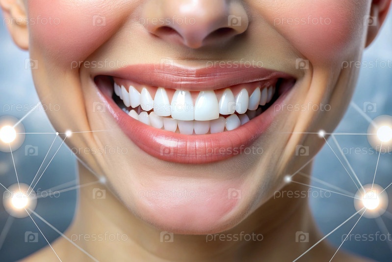 Красивая улыбка с белыми зубами. Близкий план улыбающейся женщины с натуральными полными губами и здоровой идеальной улыбкой. Концепции отбеливания зубов, стоматологического здоровья и ухода за зубами