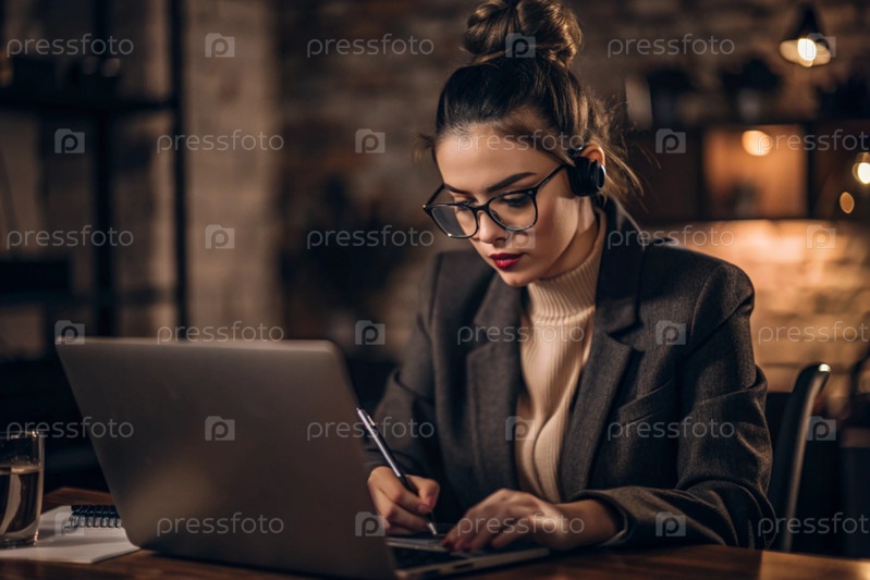 Молодая женщина фрилансер в очках и наушниках работает на ноутбуке или делает покупки в интернет-магазине