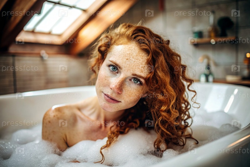 Близкий план красивой рыжеволосой женщины с веснушками и кудрявыми волосами, без макияжа. Она принимает баню из пузырьков. На заднем плане интерьер ванной комнаты в стиле лофт