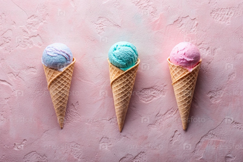 сладкий десерт. морозильные шишки разных вкусов. синий, розовый и фиолетовый мороженое на фоне трех пастельных цветов: синего, розового и фиолетового