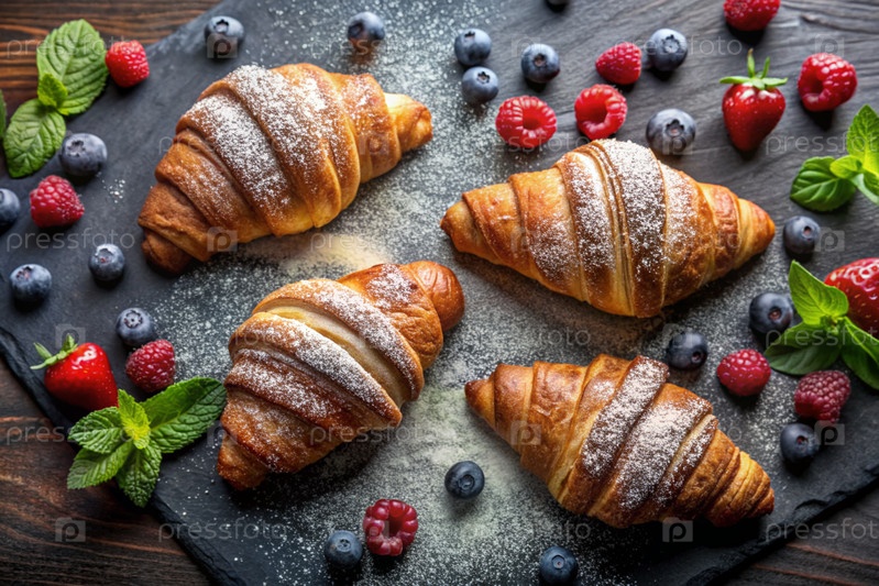 Вкусные свежевыпеченные кроассанты и ягоды на тёмном фоне сланца. французский завтрак. хорошие блинчики для выпечки. пекарня со вкусным хлебом. кондитерские изделия