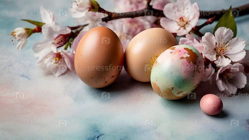 Нежные пасхальные яйца и вишневые ветви цветут на пастельном акварельном фоне с нежными полосками