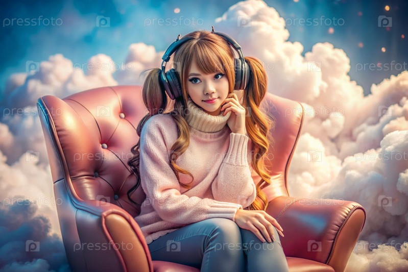 Молодая красивая японская девушка с розовыми волосами в аниме слушает музыку на беспроводных наушниках в розовых облаках