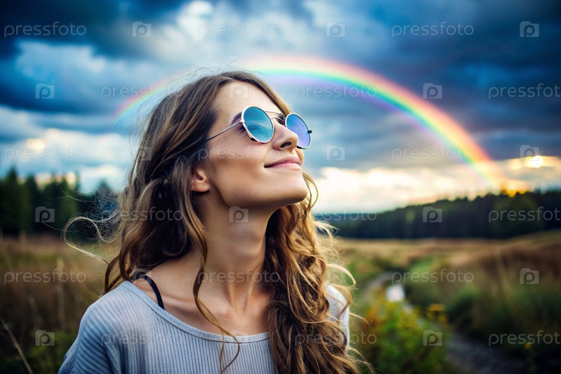 Счастливая женщина-хиппи в круглых солнцезащитных очках на фоне радуги.Девушка занимается медитацией и глубоким дыханием