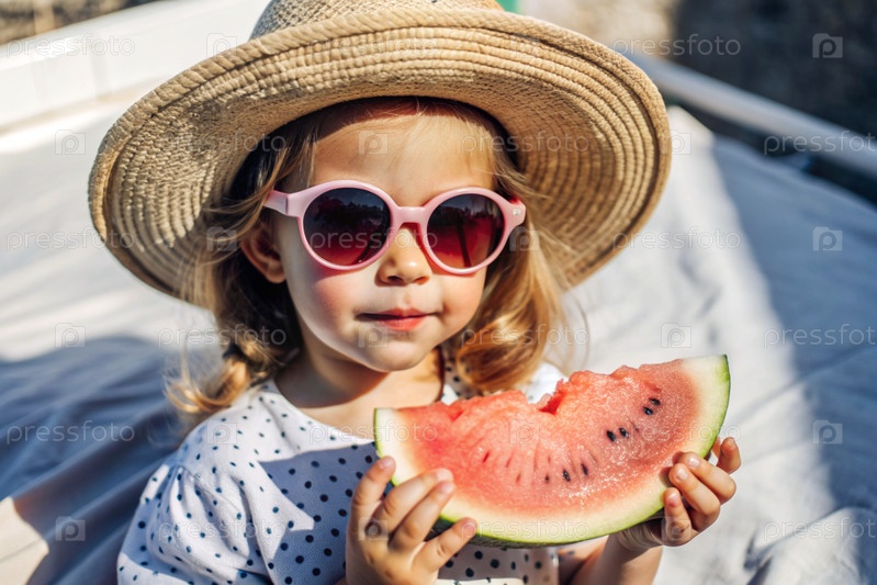 Маленькая девочка в солнцезащитных очках ест арбуз в жаркое лето. забавный счастливый ребенок с арбузом в руках. ребёнок смотрит на камеру, здоровая пища