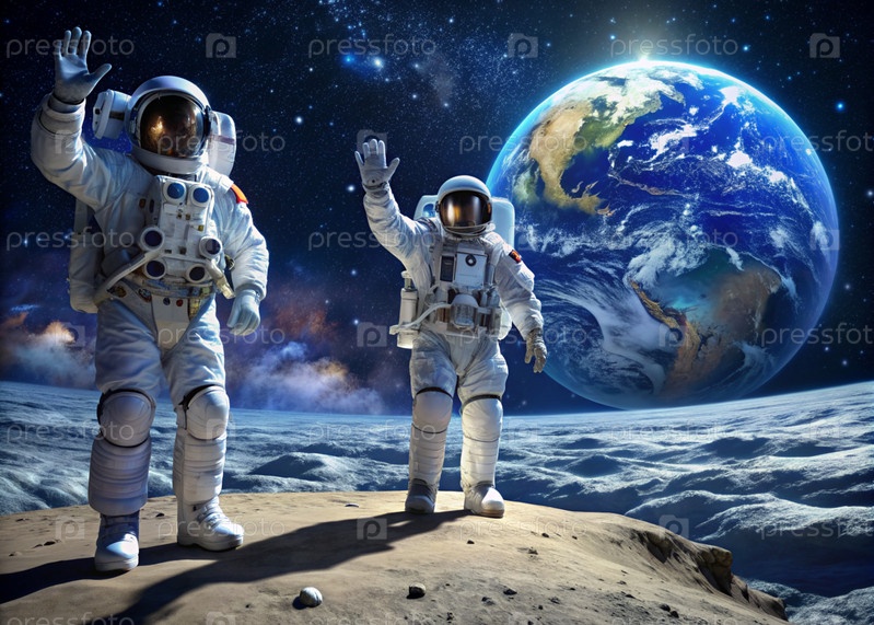 Счастливый День космоса.Астронавты в скафандре на Луне в космическом пространстве.Впечатляющий вид на планету Земля