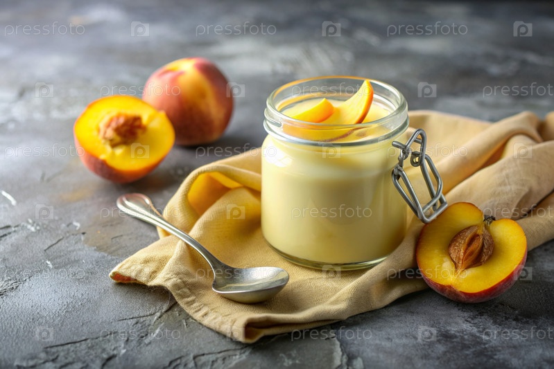 Домашний персиковый йогурт со свежими персиками, винтажной ложкой и полотенцем на стильном сером фоне