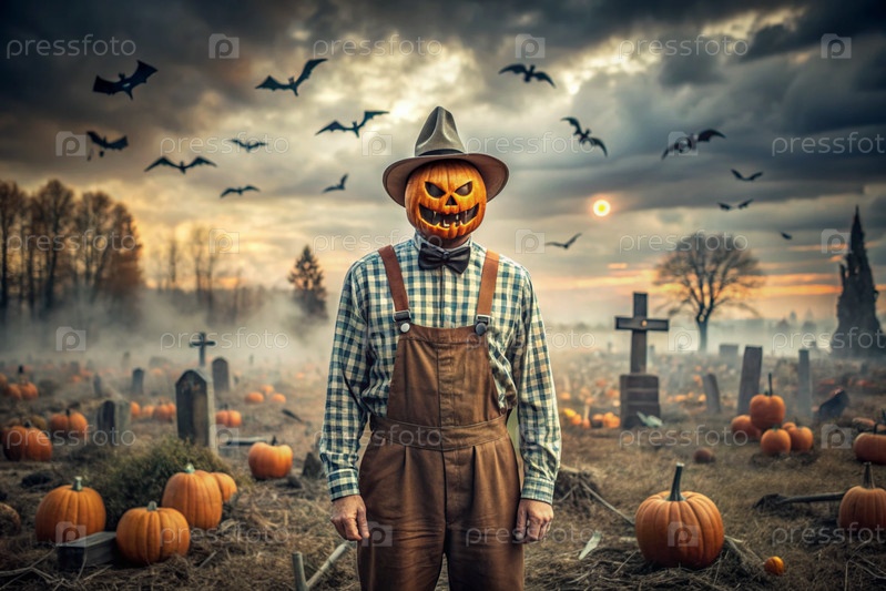 Концепция Хэллоуина. Ужасная. Страх. Устрашающий богий с тыквенной головой, квадратной рубашкой и бабочкой. Баннер, открытка