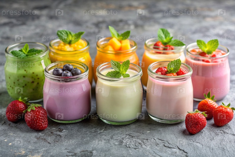 Разнообразный домашний йогурт с различными свежими ягодами и фруктами в стеклянных банках на стильном сером фоне