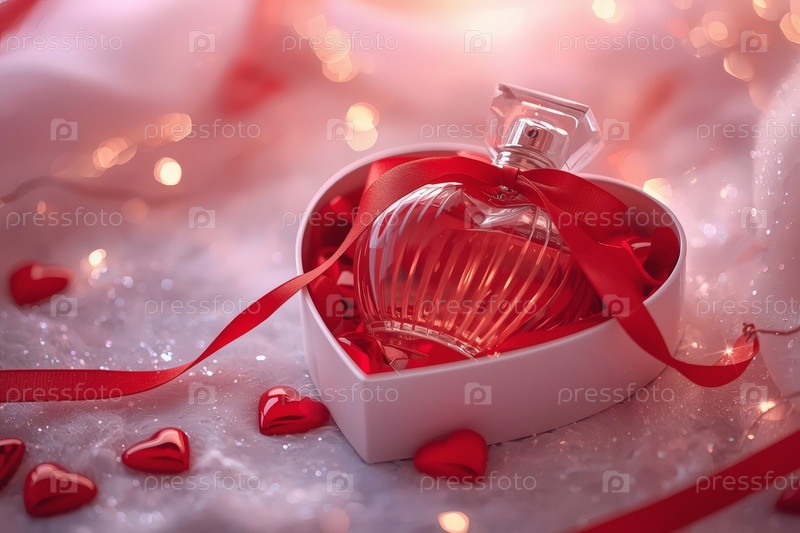 Элегантная бутылка женского парфюма в мягкой розовой подарочной коробке, украшенной красной лентой и сердцами